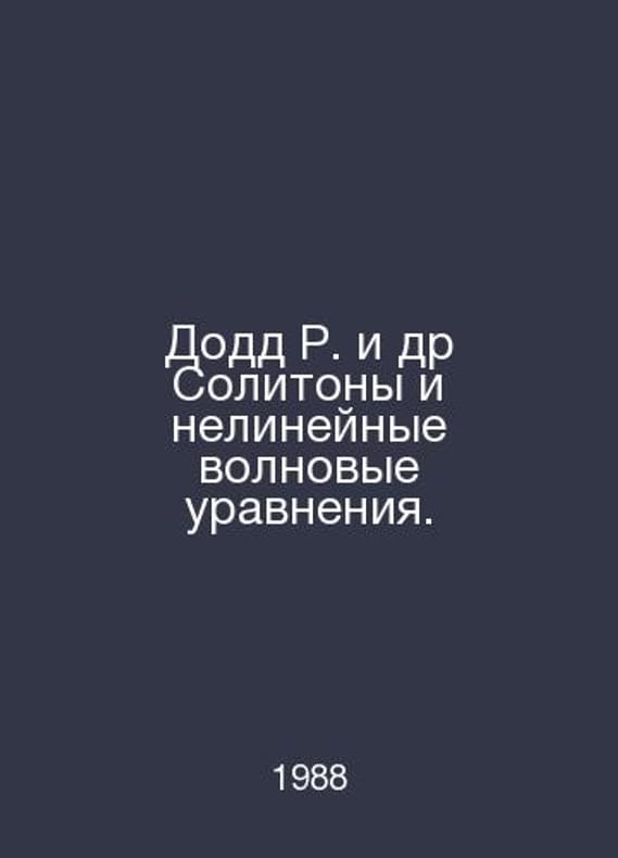 Dodd R. et al. Solitons and Non-Linear Wave Equations. In Russian /Dodd R. i dr Solitony i nelineynye volnovye uravneniya. Translated from English by MIR 1988.Contact us for details or to request photos of available books. Delivery of this book could take longer than normal due to additional handling time before shipping, and no rush delivery options are available. Please let us know if you have a specific date by which you need to receive your order.SKUalb508a5f6c63f490aa