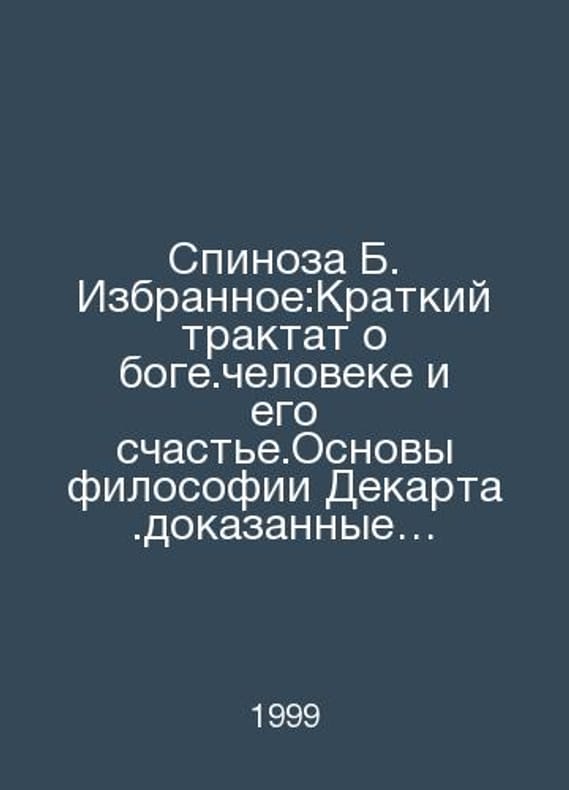 Spinoza B. Favorites: A Brief Treatise on Bogey.Man and His Happiness. The Foundations of the Philosophy of Decart.Geometrically Proven In Russian /Spinoza B. Izbrannoe:Kratkiy traktat o boge.cheloveke i ego schaste.Osnovy filosofii Dekarta.dokazannye geometricheskim sposobom.Prilozhenie.soderzhashchee metafizicheskie mysli.Traktat ob usovershenstvovanii razuma.Etika.dokazannaya v geometricheskom poryadke Red series Minsk Popurri 1999.Contact us for details or to request photos of available books. Delivery of this book could take longer than normal due to additional handling time before shipping, and no rush delivery options are available. Please let us know if you have a specific date by which you need to receive your order.SKUalb516bf09c140c1e13