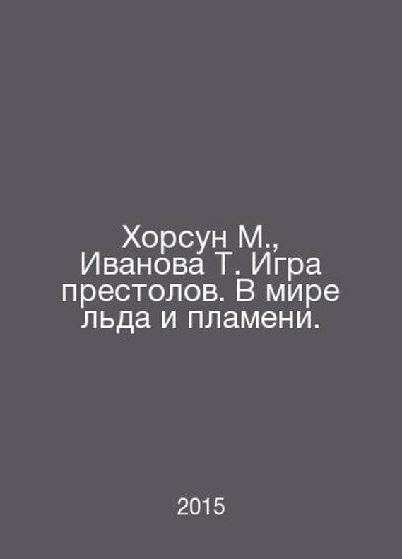 Khorsun M., Ivanova T. Game of Thrones. In a world of ice and flames. In Russian /Khorsun M., Ivanova T. Igra prestolov. V mire lda i plameni. Series: The series that conquered the world. M. Algorithm. 2015..Contact us for details or to request photos of available books. Delivery of this book could take longer than normal due to additional handling time before shipping, and no rush delivery options are available. Please let us know if you have a specific date by which you need to receive your order. SKUalb52a027e6e319c54e