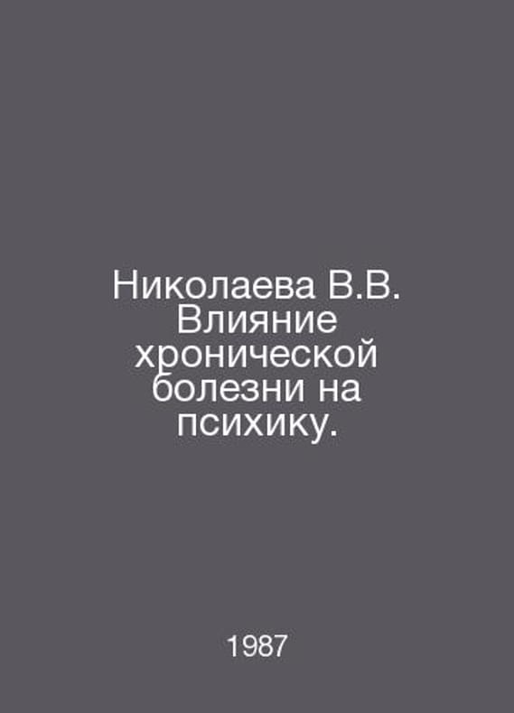 Nikolaeva V.V. The effect of chronic disease on the psyche. In Russian /Nikolaeva V.V. Vliyanie khronicheskoy bolezni na psikhiku. Monograph. Psychological Research. Moscow University Publishing House 1987.Contact us for details or to request photos of available books. Delivery of this book could take longer than normal due to additional handling time before shipping, and no rush delivery options are available. Please let us know if you have a specific date by which you need to receive your order.SKUalb53590a960901269e
