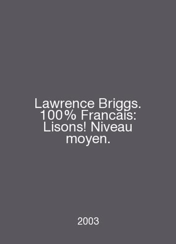 Lawrence Briggs. 100% Francais: Lisons Niveau moyen. In English /Lawrence Briggs. 100% Francais: Lisons Niveau moyen. SCHOLASTIS 2003.Contact us for details or to request photos of available books. Delivery of this book could take longer than normal due to additional handling time before shipping, and no rush delivery options are available. Please let us know if you have a specific date by which you need to receive your order.SKUalb5367718c771a0ec5