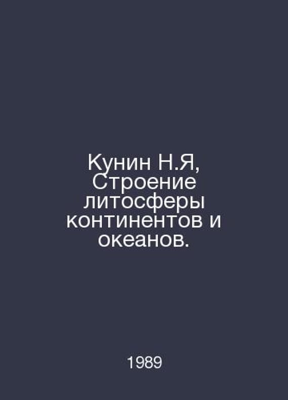 Kunin N.I, The Structure of the Lithosphere of Continents and Oceans. In Russian /Kunin N.Ya, Stroenie litosfery kontinentov i okeanov. Moscow Subsoil 1989. Contact us for details or to request photos of available books. Delivery of this book could take longer than normal due to additional handling time before shipping, and no rush delivery options are available. Please let us know if you have a specific date by which you need to receive your order.SKUalb53d71960d71b1146