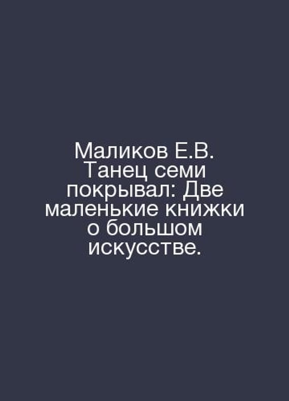 Malikov E.V. Dance of the Seven veils: Two little books about great art. In Russian /Malikov E.V. Tanets semi pokryval: Dve malenkie knizhki o bolshom iskusstve. M.: KANON and ROOI Rehabilitation 2022. 296 pp. Contact us for details or to request photos of available books. Delivery of this book could take longer than normal due to additional handling time before shipping, and no rush delivery options are available. Please let us know if you have a specific date by which you need to receive your order.SKUalb5493cf1ef80cbd2d
