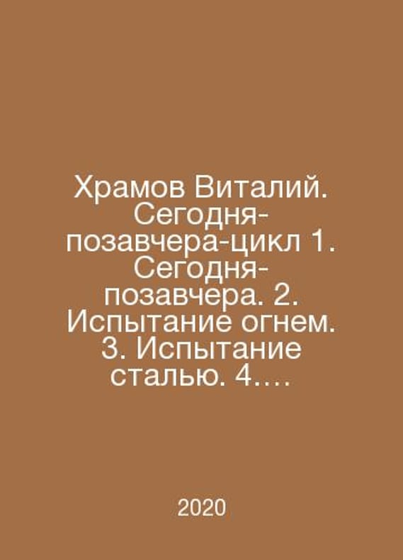 Khramov Vitaly. Today-the day before yesterday-cycle 1. Today-the day before yesterday. 2. Test by fire. 3. Test by steel. 4. Test by time. In Russian /Khramov Vitaliy. Segodnya-pozavchera-tsikl 1. Segodnya-pozavchera. 2. Ispytanie ognem. 3. Ispytanie stalyu. 4. Ispytanie vremenem. A series of military fiction-collection Ast 2020.Contact us for details or to request photos of available books. Delivery of this book could take longer than normal due to additional handling time before shipping, and no rush delivery options are available. Please let us know if you have a specific date by which you need to receive your order.SKUalb5508b060dba9c202