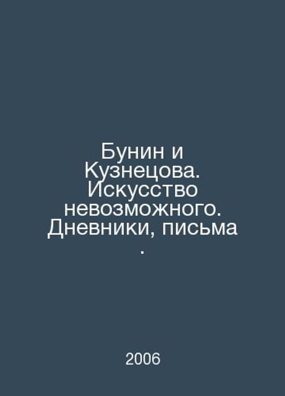 Bunin and Kuznetsova. The Art of the Impossible. Diaries, Letters. In Russian /Bunin i Kuznetsova. Iskusstvo nevozmozhnogo. Dnevniki, pisma. M. Publishing House Grifon. 2006.Contact us for details or to request photos of available books. Delivery of this book could take longer than normal due to additional handling time before shipping, and no rush delivery options are available. Please let us know if you have a specific date by which you need to receive your order.SKUalb5570a640a598a1ee