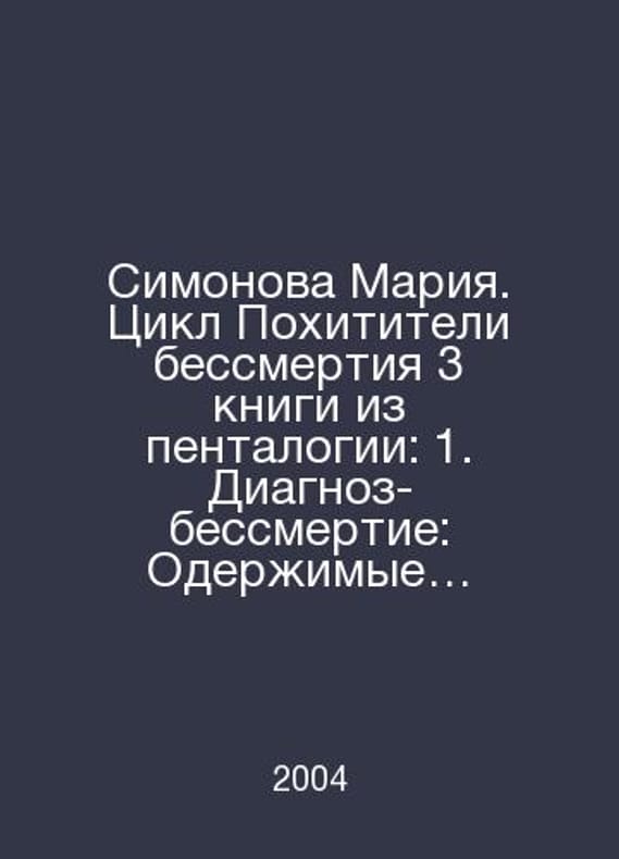 Simonova Maria. Cycle Kidnappers of Immortality 3 books from pentology: 1. Diagnosis-immortality: Obsessed with immortality (in one volume 2004). 2. The habit of dying (Co-authored with Dmitry Kravtsov 2004). 3. The habit of living (2005). In Russian /Simonova Mariya. Tsikl Pokhititeli bessmertiya 3 knigi iz pentalogii: 1. Diagnoz-bessmertie: Oderzhimye bessmertiem( v odnom tome 2004). 2. Privychka umirat(V soavtorstve s Dmitriem Kravtsovym 2004). 3. Privychka zhit(2005). Series: Absolute Weapons. M. Eksmo. 2004-2005. Contact us for details or to request photos of available books. Delivery of this book could take longer than normal due to additional handling time before shipping, and no rush delivery options are available. Please let us know if you have a specific date by which you need to receive your order.SKUalb55e0a9a915715325