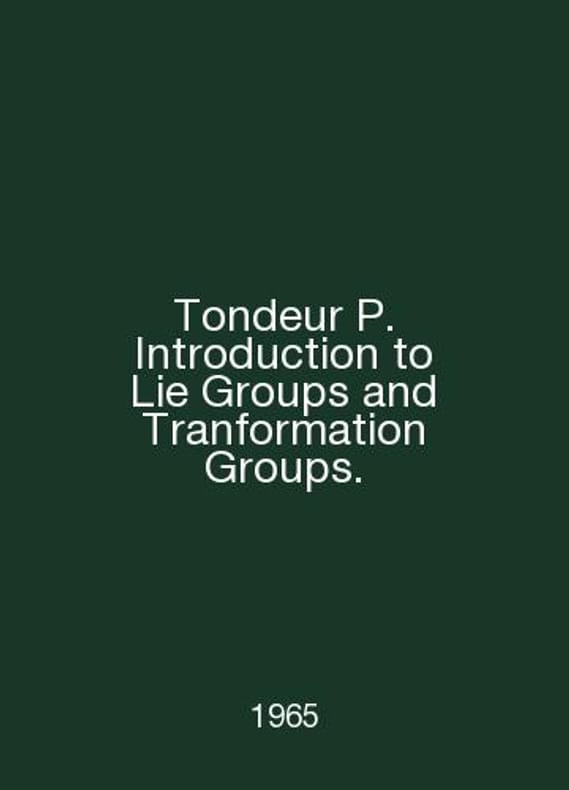 Tondeur Introduction to Lie Groups and Transformation Groups. In English /Tondeur Introduction to Lie Groups and Tranformation Groups. Berlin O. Springer, 1965.Contact us for details or to request photos of available books. Delivery of this book could take longer than normal due to additional handling time before shipping, and no rush delivery options are available. Please let us know if you have a specific date by which you need to receive your order.SKUalb57ca942c01505cc4