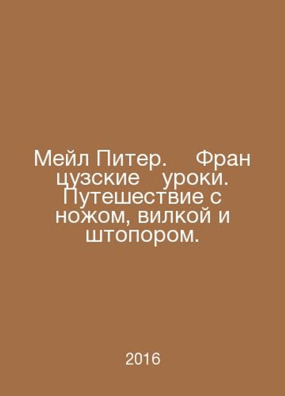 Mail Peter. French lessons. Travelling with a knife, fork and corkscrew. In Russian /Meyl Piter.† Frantsuzskie†uroki. Puteshestvie s nozhom, vilkoy i shtoporom. Translation from English. S.Pb.ABC. 2016 year..Contact us for details or to request photos of available books. Delivery of this book could take longer than normal due to additional handling time before shipping, and no rush delivery options are available. Please let us know if you have a specific date by which you need to receive your order. SKUalb5c111080dc85fa08