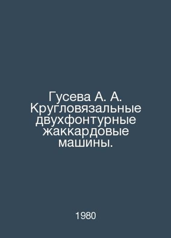 Guseva A. A. Round-knit double-fountain jacquard machines. In Russian /Guseva A. A. Kruglovyazalnye dvukhfonturnye zhakkardovye mashiny. M. Light Industry. 1980.. Contact us for details or to request photos of available books. SKUalb5c3ebdc9fc80e899.