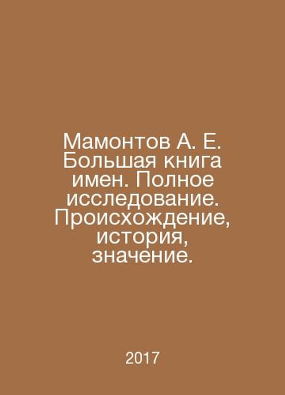 Mamontov A.E. Big book of names. Complete research. Origins, history, meaning. In Russian /Mamontov A. E. Bolshaya kniga imen. Polnoe issledovanie. Proiskhozhdenie, istoriya, znachenie. The Big Book of Secret Knowledge. M. ACT. 2017. Contact us for details or to request photos of available books. Delivery of this book could take longer than normal due to additional handling time before shipping, and no rush delivery options are available. Please let us know if you have a specific date by which you need to receive your order. SKUalb5d4488fe1dae4828