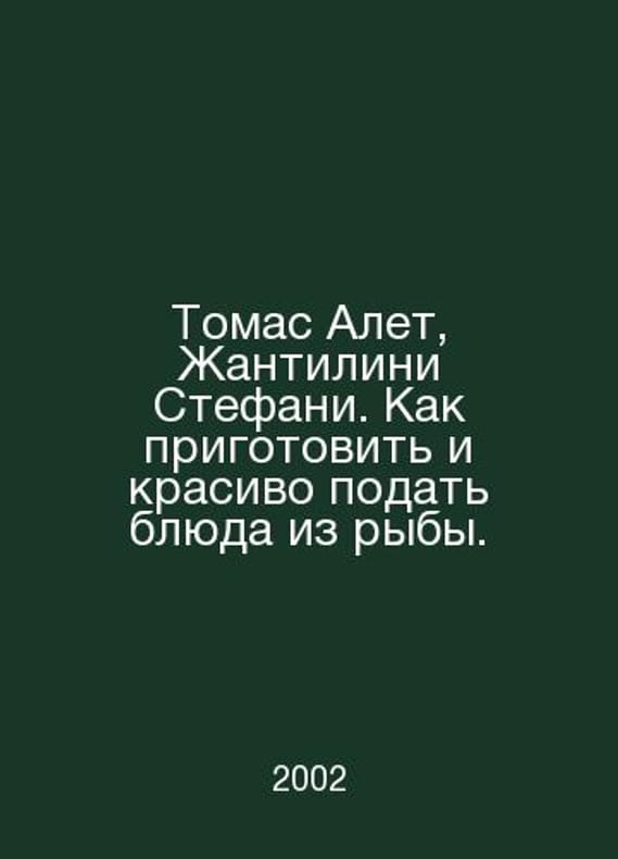 Thomas Alet, Gentilini Stefani. How to prepare and serve fish dishes beautifully. In Russian /Tomas Alet, Zhantilini Stefani. Kak prigotovit i krasivo podat blyuda iz ryby. Translated from French by M. Interbukbusiness 2002.. Contact us for details or to request photos of available books. SKUalb5d93d6abae678f08.