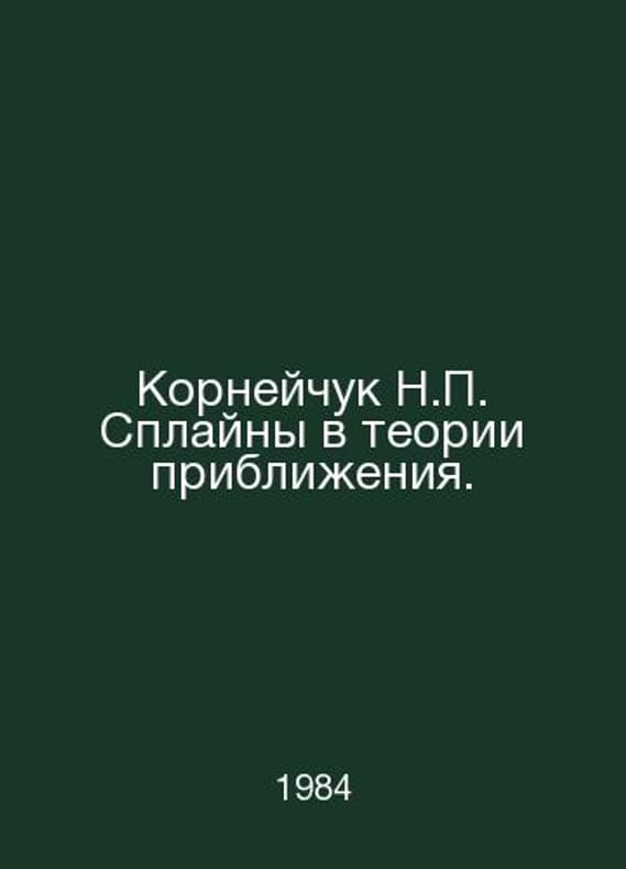 Korneychuk N. Splains in approximation theory. In Russian /Korneychuk N. Splayny v teorii priblizheniya. M. Science 1984.Contact us for details or to request photos of available books. Delivery of this book could take longer than normal due to additional handling time before shipping, and no rush delivery options are available. Please let us know if you have a specific date by which you need to receive your order.SKUalb5e614eb886ee6a89