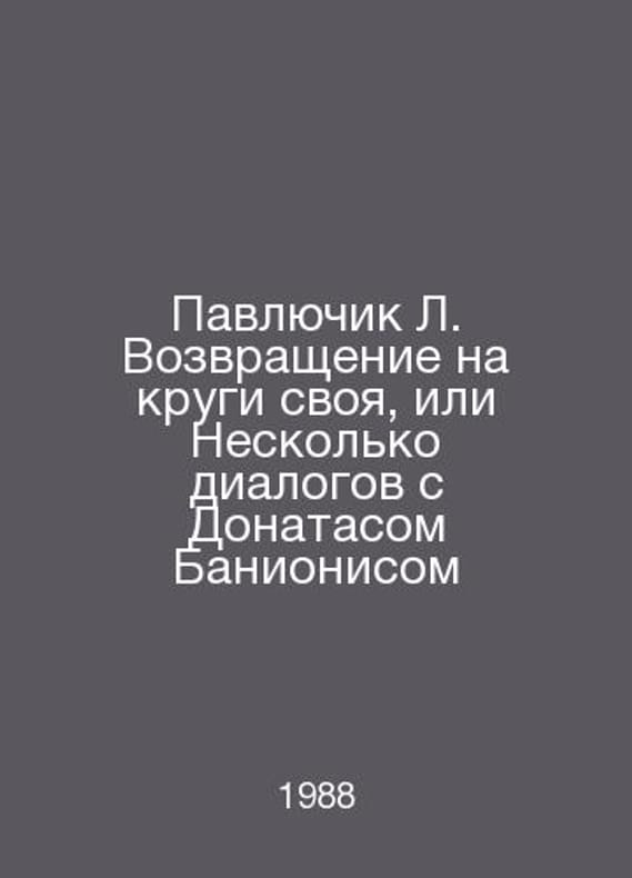 Pavlyuchik L. Return to his circle, or Several dialogues with Donatas Banionis In Russian /Pavlyuchik L. Vozvrashchenie na krugi svoya, ili Neskolko dialogov s Donatasom Banionisom M 1988.. Contact us for details or to request photos of available books. SKUalb5f406fee34e1d2e5.