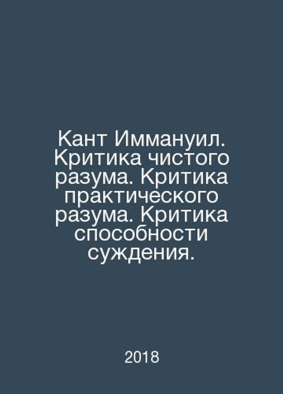 Kant Immanuel. Criticism of pure reason. Criticism of practical reason. Criticism of judgment. In Russian /Kant Immanuil. Kritika chistogo razuma. Kritika prakticheskogo razuma. Kritika sposobnosti suzhdeniya. Series: Library of Selected Works. Moscow: E, 2018.Contact us for details or to request photos of available books. Delivery of this book could take longer than normal due to additional handling time before shipping, and no rush delivery options are available. Please let us know if you have a specific date by which you need to receive your order.SKUalb5f50e0c41847692f
