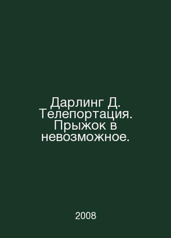 Darling D. Teleportation. Jumping into the impossible. In Russian /Darling D. Teleportatsiya. Pryzhok v nevozmozhnoe. M., Eksmo 2008. Contact us for details or to request photos of available books. Delivery of this book could take longer than normal due to additional handling time before shipping, and no rush delivery options are available. Please let us know if you have a specific date by which you need to receive your order. SKUalb5fd10581f5f55e6e