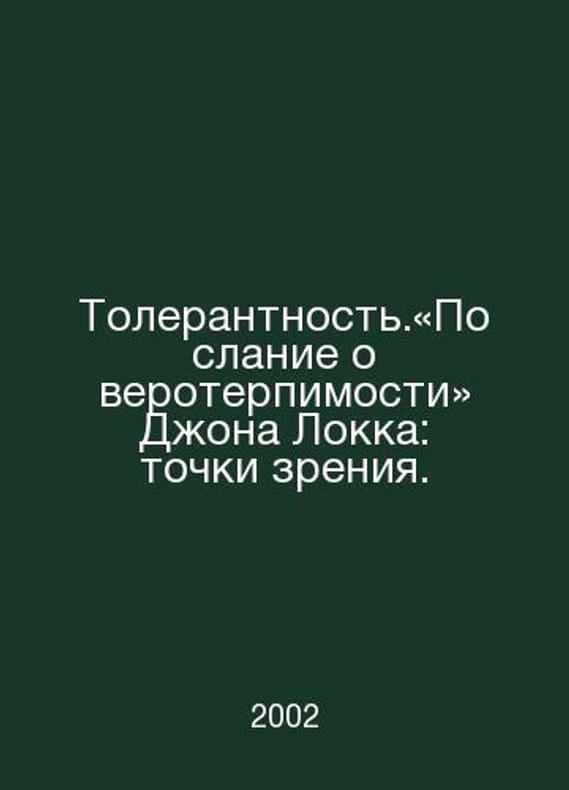 Tolerance: John Lockes Message of Tolerance: Perspectives. In Russian /Tolerantnost.´Poslanie o veroterpimosti Dzhona Lokka: tochki zreniya. Ural Interregional Institute of Social Sciences. Department of Philosophy History at Ural State University. Ekaterinburg Ural University Publishing House 2002.Contact us for details or to request photos of available books. Delivery of this book could take longer than normal due to additional handling time before shipping, and no rush delivery options are available. Please let us know if you have a specific date by which you need to receive your order.SKUalb5fde33b1044d7e7a