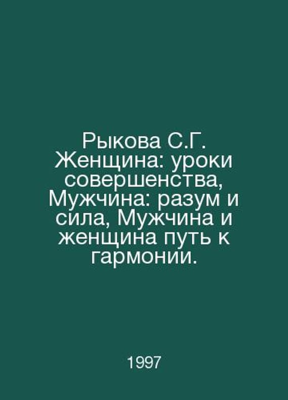 Rykova S.G. Woman: Lessons of Perfection, Male: Mind and Power, Male and Female Path to Harmony. In Russian /Rykova S.G. Zhenshchina: uroki sovershenstva, Muzhchina: razum i sila, Muzhchina i zhenshchina put k garmonii. Tet-a-tete series Kharkiv Grif 1997. Contact us for details or to request photos of available books. Delivery of this book could take longer than normal due to additional handling time before shipping, and no rush delivery options are available. Please let us know if you have a specific date by which you need to receive your order. SKUalb603d3c6ec84c7fc3