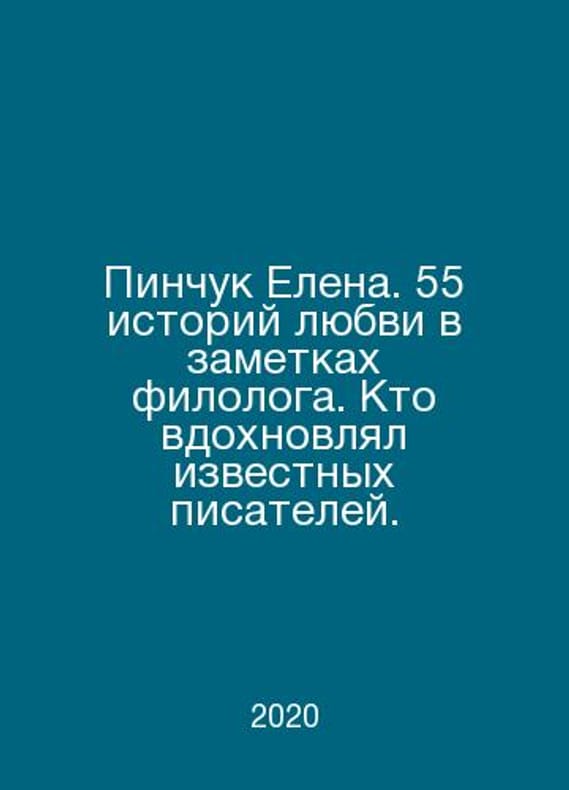 Pinchuk Elena. 55 love stories in philologists notes. Who inspired famous writers. In Russian /Pinchuk Elena. 55 istoriy lyubvi v zametkakh filologa. Kto vdokhnovlyal izvestnykh pisateley. Series: Classics of Lectures. Moscow: ACT, 2020.Contact us for details or to request photos of available books. Delivery of this book could take longer than normal due to additional handling time before shipping, and no rush delivery options are available. Please let us know if you have a specific date by which you need to receive your order.SKUalb619d70adf1b68d68