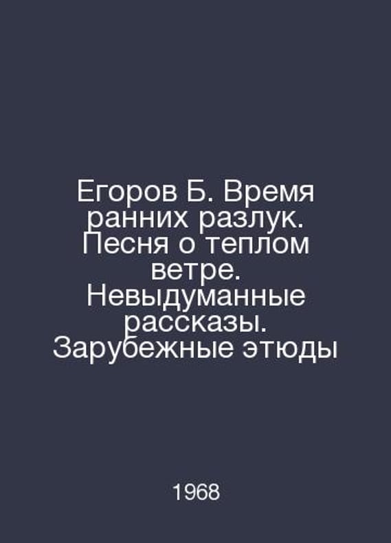 Yegorov B. The Time of Early Separations. A Song of Warm Wind. Unmade Stories. Foreign Studies In Russian /Egorov B. Vremya rannikh razluk. Pesnya o teplom vetre. Nevydumannye rasskazy. Zarubezhnye etyudy Library of the Young Patriot M. Voenizdat 1968.Contact us for details or to request photos of available books. Delivery of this book could take longer than normal due to additional handling time before shipping, and no rush delivery options are available. Please let us know if you have a specific date by which you need to receive your order.SKUalb61df757ea4ee3a23