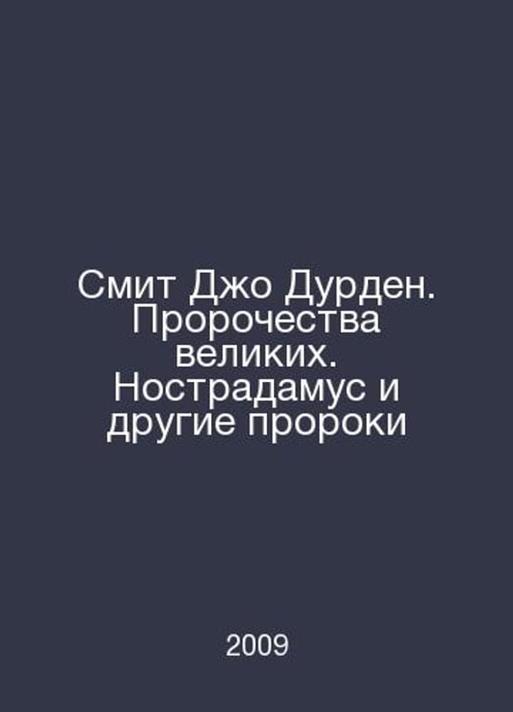 Joe Durden Smith: The Prophecies of the Great. Nostradamus and the Other Prophets In Russian /Smit Dzho Durden. Prorochestva velikikh. Nostradamus i drugie proroki Family Leisure Club 2009. Contact us for details or to request photos of available books. Delivery of this book could take longer than normal due to additional handling time before shipping, and no rush delivery options are available. Please let us know if you have a specific date by which you need to receive your order. SKUalb629b54268bca998c