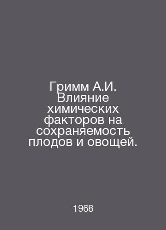 Grimm A.I. The influence of chemical factors on the preservation of fruit and vegetables. In Russian /Grimm A.I. Vliyanie khimicheskikh faktorov na sokhranyaemost plodov i ovoshchey. M. Economics. 1968.Contact us for details or to request photos of available books. Delivery of this book could take longer than normal due to additional handling time before shipping, and no rush delivery options are available. Please let us know if you have a specific date by which you need to receive your order.SKUalb62a274e9aa7d95cc