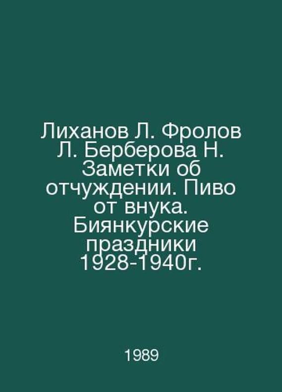 Likhanov L. Frolov L. Berberova N. Notes on alienation. Beer from grandson. Biyankur holidays 1928-1940. In Russian /Likhanov L. Frolov L. Berberova N. Zametki ob otchuzhdenii. Pivo ot vnuka. Biyankurskie prazdniki 1928-1940g. Likhanov L. Frolov L. Berberova N. Notes on alienation. Beer from grandson. Biyankur holidays 1928-1940 1989.Contact us for details or to request photos of available books. Delivery of this book could take longer than normal due to additional handling time before shipping, and no rush delivery options are available. Please let us know if you have a specific date by which you need to receive your order.SKUalb63c2e9f21958ce41