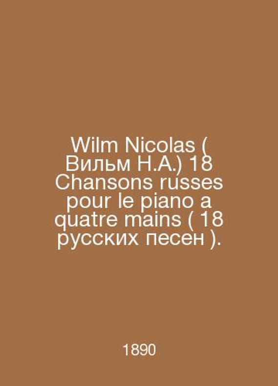 Wilm Nicolas (Wilm N.A.) 18 Chansons russes pour le piano a quatre mains (18 Russian songs). In Russian /Wilm Nicolas ( Vilm N.A.) 18 Chansons russes pour le piano a quatre mains ( 18 russkikh pesen ). San.1-6 (compilation). A.Gutheil. Moscow circa 1890. Contact us for details or to request photos of available books. Delivery of this book could take longer than normal due to additional handling time before shipping, and no rush delivery options are available. Please let us know if you have a specific date by which you need to receive your order.SKUalb6854adfe6a16ad82