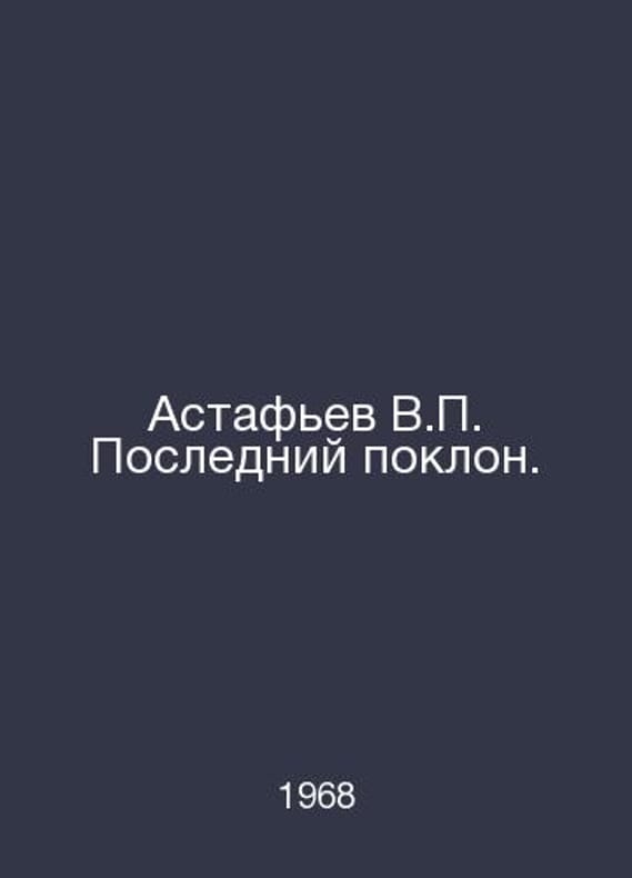 Astafiev V. Last bow. In Russian /Astafev V. Posledniy poklon. The Story. Artists V. and A. Motovilov. First Edition. Perm. Perm Book Publishing House. 1968.Contact us for details or to request photos of available books. Delivery of this book could take longer than normal due to additional handling time before shipping, and no rush delivery options are available. Please let us know if you have a specific date by which you need to receive your order.SKUalb68cd7b11ef69f3cd