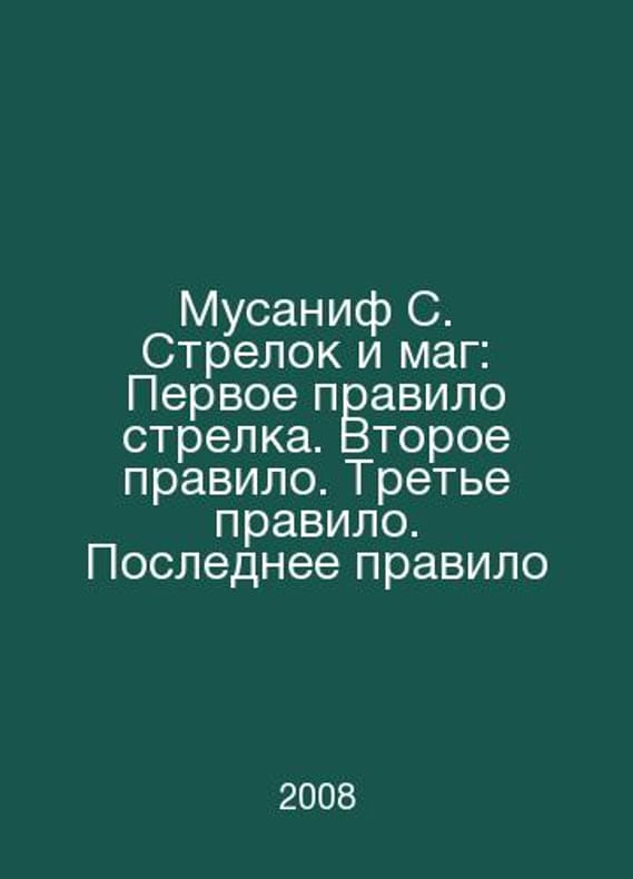 Mussanif S. The Archer and the Magician: The First Rule of the Archer. The Second Rule. The Third Rule. The Last Rule In Russian /Musanif S. Strelok i mag: Pervoe pravilo strelka. Vtoroe pravilo. Trete pravilo. Poslednee pravilo Tetralogy in one volume of M. Alpha-book 2008. Contact us for details or to request photos of available books. Delivery of this book could take longer than normal due to additional handling time before shipping, and no rush delivery options are available. Please let us know if you have a specific date by which you need to receive your order.SKUalb696a4b6906716640