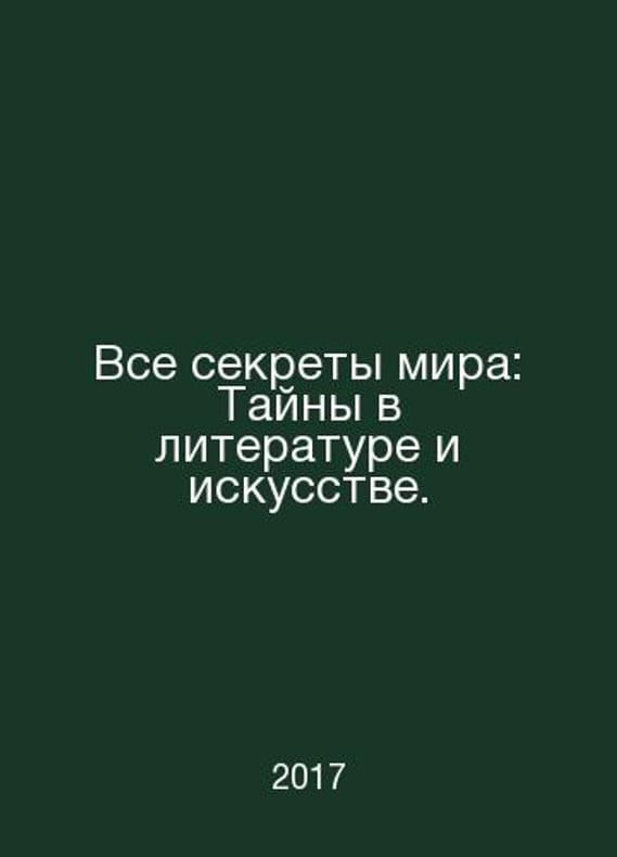 All the Secrets of the World: Secrets in Literature and Art. In Russian /Vse sekrety mira: Tayny v literature i iskusstve. The Non-Canonical Aesthetics of St. Petersburg-Tver Publishing House Marina Batasova 2017..Contact us for details or to request photos of available books. Delivery of this book could take longer than normal due to additional handling time before shipping, and no rush delivery options are available. Please let us know if you have a specific date by which you need to receive your order. SKUalb69d2f7be449985cd