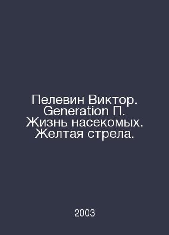 Pelevin Victor. Generation The life of insects. The Yellow Arrow. In Russian /Pelevin Viktor. Generation Zhizn nasekomykh. Zheltaya strela. Serial design of A.A. Kudryavtsev. Moscow. Wagrius. 2003. Contact us for details or to request photos of available books. Delivery of this book could take longer than normal due to additional handling time before shipping, and no rush delivery options are available. Please let us know if you have a specific date by which you need to receive your order.SKUalb6a04e4f02ce065cd