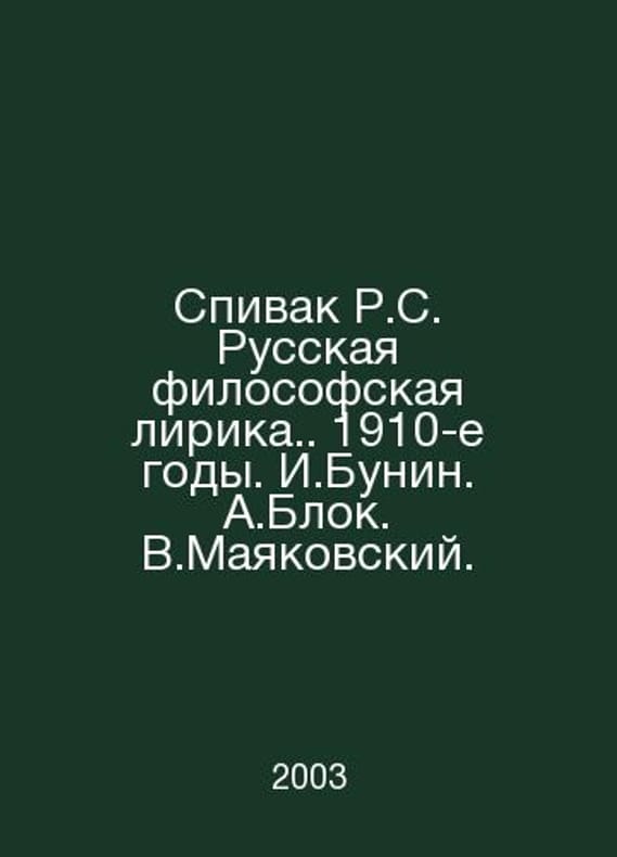 Spivak R.S. Russian Philosophical Lyrics. 1910s. I.Bunin. A.Blok. V.Mayakovsky. In Russian /Spivak R.S. Russkaya filosofskaya lirika. 1910-e gody. I.Bunin. A.Blok. V.Mayakovskiy. M. Flint. 2003. Contact us for details or to request photos of available books. Delivery of this book could take longer than normal due to additional handling time before shipping, and no rush delivery options are available. Please let us know if you have a specific date by which you need to receive your order. SKUalb6b97731a03c8b1f7
