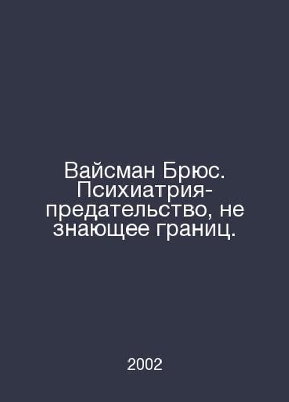 Wiseman Bruce: Psychiatry is a betrayal that knows no boundaries. In Russian /Vaysman Bryus. Psikhiatriya- predatelstvo, ne znayushchee granits. The series: Psychiatry is an absolute betrayal.Contact us for details or to request photos of available books. Delivery of this book could take longer than normal due to additional handling time before shipping, and no rush delivery options are available. Please let us know if you have a specific date by which you need to receive your order.SKUalb6c12ef7b4d658ed4