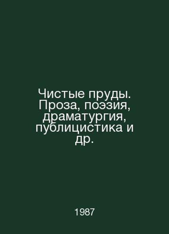 Pure Ponds. Prose, Poetry, Drama, Journalism, etc. In Russian /Chistye prudy. Proza, poeziya, dramaturgiya, publitsistika i dr. M Moscow Worker 1987.Contact us for details or to request photos of available books. Delivery of this book could take longer than normal due to additional handling time before shipping, and no rush delivery options are available. Please let us know if you have a specific date by which you need to receive your order.SKUalb6e31f8b4064940fa