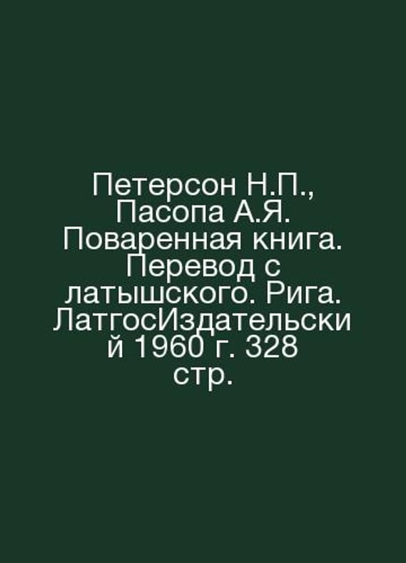 Peterson N., Pasopa A.I. Cookbook. Translation from Latvian. Riga. Latvian Publishing 1960. 328 pp. In Russian /Peterson N., Pasopa A.Ya. Povarennaya kniga. Perevod s latyshskogo. Riga. LatgosIzdatelskiy 1960 g. 328 str. Peterson N., Pasopa A.I. Cookbook. Translation from Latvian. Riga. Latvian Publishing 1960. 328 p. 1960.Contact us for details or to request photos of available books. Delivery of this book could take longer than normal due to additional handling time before shipping, and no rush delivery options are available. Please let us know if you have a specific date by which you need to receive your order. SKUalb6e58d0487326584a