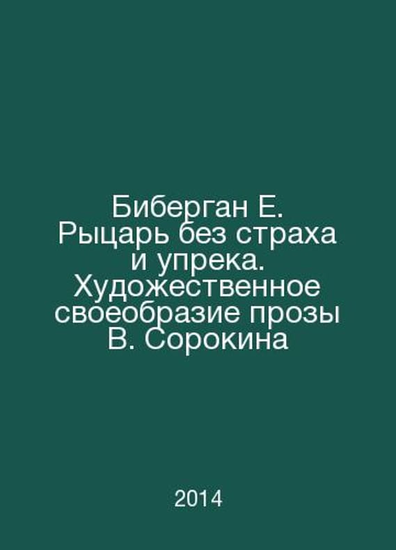 Biebergan E. Knight without fear or reproach. Artistic peculiarity of V. Sorokins prose In Russian /Bibergan E. Rytsar bez strakha i upreka. Khudozhestvennoe svoeobrazie prozy V. Sorokina St. Petersburg: Petropolis, 2014. Contact us for details or to request photos of available books. Delivery of this book could take longer than normal due to additional handling time before shipping, and no rush delivery options are available. Please let us know if you have a specific date by which you need to receive your order. SKUalb6e5b4d2793ea5463