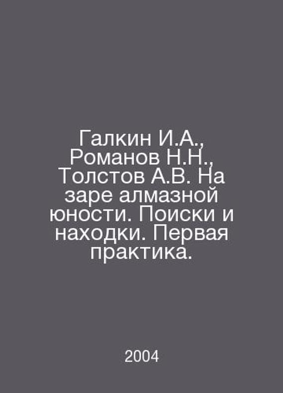 Galkin I.A., Romanov N.N., Tolstov A.V. At the dawn of diamond youth. Searches and finds. First practice. In Russian /Galkin I.A., Romanov N.N., Tolstov A.V. Na zare almaznoy yunosti. Poiski i nakhodki. Pervaya praktika. Essays and Story. Novosibirsk: Sibtechnoreserve. 2004. Contact us for details or to request photos of available books. Delivery of this book could take longer than normal due to additional handling time before shipping, and no rush delivery options are available. Please let us know if you have a specific date by which you need to receive your order.SKUalb70453a340f26ff57