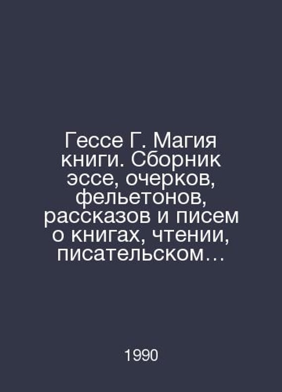 Hesse G. The magic of books. A collection of essays, essays, essays, essays, short stories, and letters about books, reading, writing, bibliophilia, book publishing, and bookselling. In Russian /Gesse G. Magiya knigi. Sbornik esse, ocherkov, feletonov, rasskazov i pisem o knigakh, chtenii, pisatelskom trude, bibliofilstve, knigoizdanii i knigotorgovle The shelf of the bibliophile M Book 1990.. Contact us for details or to request photos of available books. SKUalb7137ed76ee862c88.