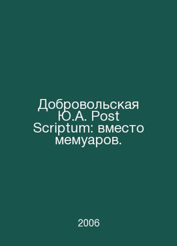 Dobrovolskaya Yu.A. Post Scriptum: instead of memoirs. In Russian /Dobrovolskaya Yu.A. Post Scriptum: vmesto memuarov. The series RUSSKIE ZARUBEZHIE S.Pb.Aletheia 2006. Contact us for details or to request photos of available books. Delivery of this book could take longer than normal due to additional handling time before shipping, and no rush delivery options are available. Please let us know if you have a specific date by which you need to receive your order. SKUalb72cf1f68379aab3a