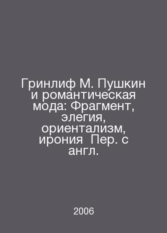 M. Pushkins Greenleaf and Romantic Fashion: Fragment, Elegy, Orientalism, Irony. In Russian /Grinlif M. Pushkin i romanticheskaya moda: Fragment, elegiya, orientalizm, ironiya Per. s angl. St. Petersburg Academic Project 2006. Contact us for details or to request photos of available books. Delivery of this book could take longer than normal due to additional handling time before shipping, and no rush delivery options are available. Please let us know if you have a specific date by which you need to receive your order. SKUalb73001039b51be245