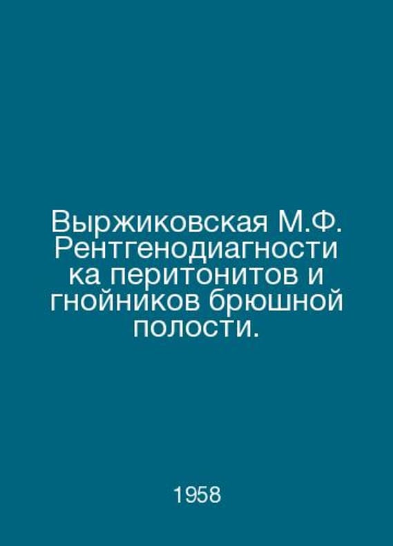 Vyrzhikovskaya M.F. X-ray diagnosis of peritonitis and abdominal ulcers. In Russian /Vyrzhikovskaya M.F. Rentgenodiagnostika peritonitov i gnoynikov bryushnoy polosti. M MEDGIZ 1958.Contact us for details or to request photos of available books. Delivery of this book could take longer than normal due to additional handling time before shipping, and no rush delivery options are available. Please let us know if you have a specific date by which you need to receive your order.SKUalb7433ad31f8ec6789