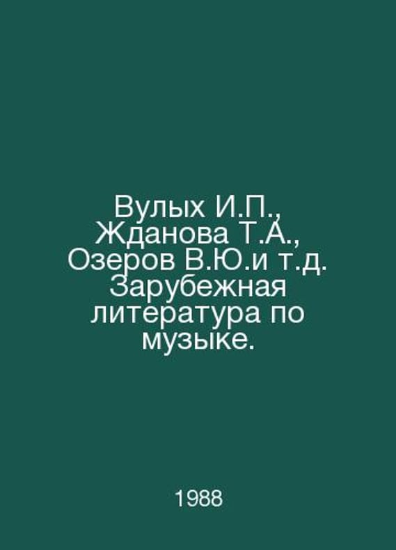 Vulykh I., Zhdanova T.A., Ozerov V.Yu., etc In Russian /Vulykh I., Zhdanova T.A., Ozerov V.Yu.i t.d. Zarubezhnaya literatura po muzyke. M Soviet Composer 1988. Contact us for details or to request photos of available books. Delivery of this book could take longer than normal due to additional handling time before shipping, and no rush delivery options are available. Please let us know if you have a specific date by which you need to receive your order.SKUalb7841e199d2583c3a