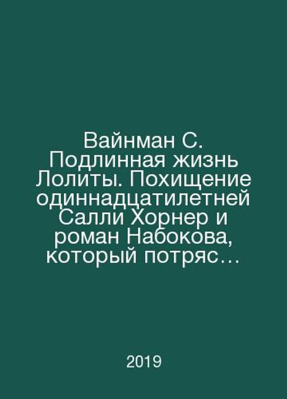 Weinman S. The True Life of Lolita: The Kidnapping of Eleven-Year-Old Sally Horner and Nabokovs Novel That Shook the World. In Russian /Vaynman S. Podlinnaya zhizn Lolity. Pokhishchenie odinnadtsatiletney Salli Khorner i roman Nabokova, kotoryy potryas mir. Translated from English by Yu. M. Poleschuk Individual 2019. Contact us for details or to request photos of available books. Delivery of this book could take longer than normal due to additional handling time before shipping, and no rush delivery options are available. Please let us know if you have a specific date by which you need to receive your order. SKUalb78919560a1fb505b