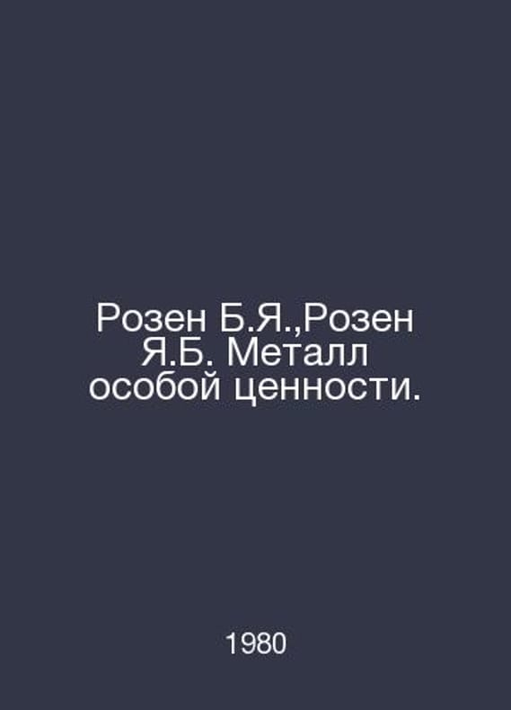 Rosen B.Y., Rosen J.B. Metal of Special Value. In Russian /Rozen B.Ya., Rozen Ya.B. Metall osoboy tsennosti. M Metallurgy 1980. Contact us for details or to request photos of available books. Delivery of this book could take longer than normal due to additional handling time before shipping, and no rush delivery options are available. Please let us know if you have a specific date by which you need to receive your order.SKUalb78d27ce3a29789eb