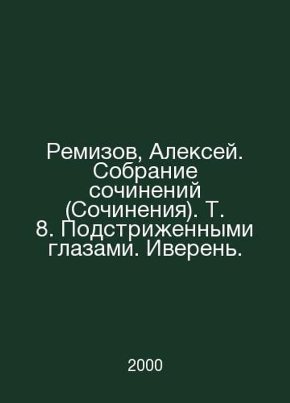 Remizov, Alexey. Collection of works (Works). Vol. 8. With shaved eyes. Iveren. In Russian /Remizov, Aleksey. Sobranie sochineniy (Sochineniya). T. 8. Podstrizhennymi glazami. Iveren. Fit-up text with trimmed eyes, the following, comment, appended by A.M. Gracheva. Fit-up text by Yvernya O. Raevskaya-Hughes, A.M. Gracheva. Afterward, commentary to Ivernya O. Raevskaya-Hughes.Contact us for details or to request photos of available books. Delivery of this book could take longer than normal due to additional handling time before shipping, and no rush delivery options are available. Please let us know if you have a specific date by which you need to receive your order.SKUalb78fb801350d99dc3