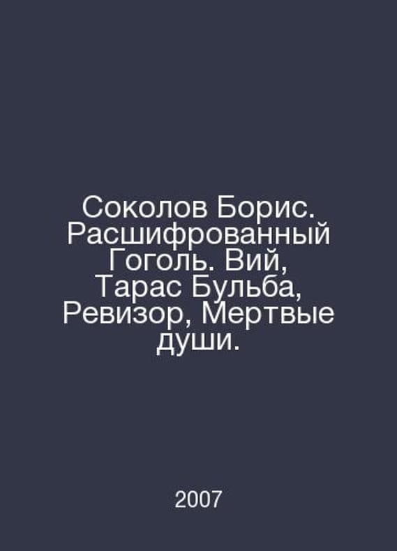 Boris Sokolov. Gogol deciphered. Viy, Taras Bulba, Auditor, Dead Souls. In Russian /Sokolov Boris. Rasshifrovannyy Gogol. Viy, Taras Bulba, Revizor, Mertvye dushi. Ser: Decoded Literature. Gogol. M Yauza-press 2007. Contact us for details or to request photos of available books. Delivery of this book could take longer than normal due to additional handling time before shipping, and no rush delivery options are available. Please let us know if you have a specific date by which you need to receive your order. SKUalb7ad748e1b40c9e74