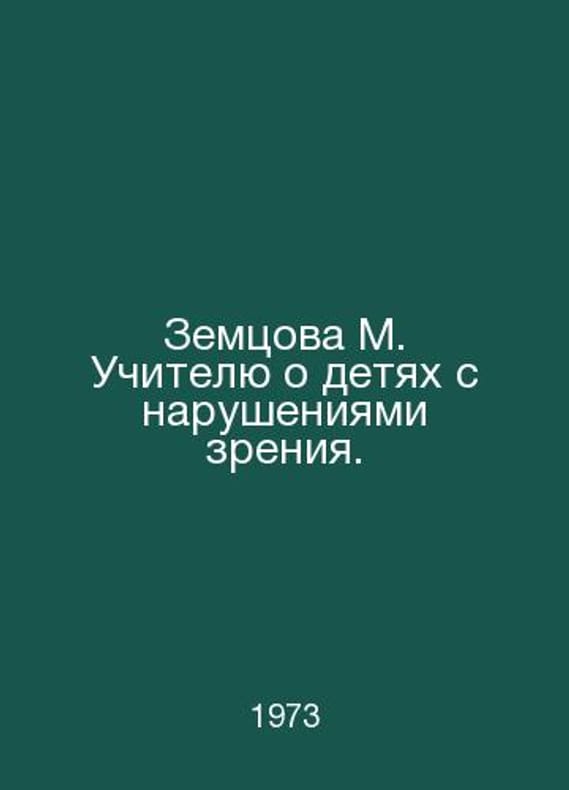 Zemtsova M. Teacher about visually impaired children. In Russian /Zemtsova M. Uchitelyu o detyakh s narusheniyami zreniya. M Enlightenment 1973.Contact us for details or to request photos of available books. Delivery of this book could take longer than normal due to additional handling time before shipping, and no rush delivery options are available. Please let us know if you have a specific date by which you need to receive your order.SKUalb7b500656c4590f74
