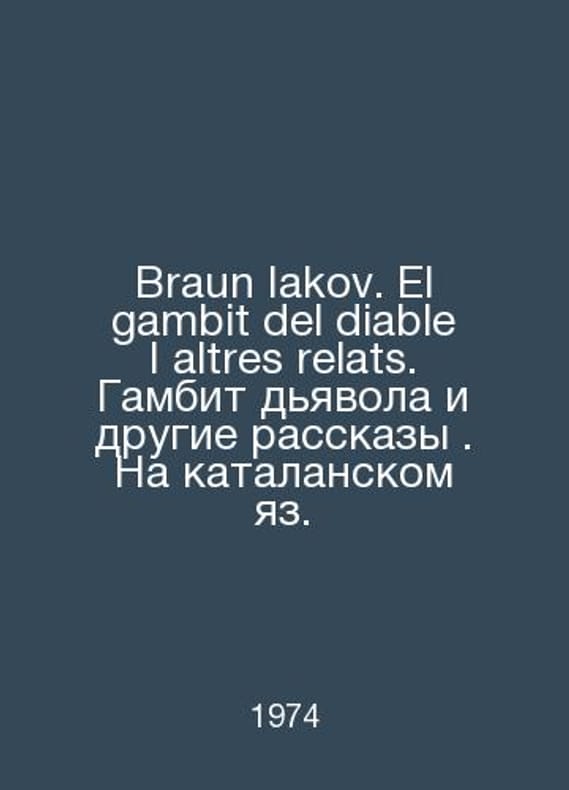 Braun Iakov. El gambit del diable I altres relats. The devils gambit and other stories. In Catalan. In Russian /Braun Iakov. El gambit del diable I altres relats. Gambit dyavola i drugie rasskazy. Na katalanskom yaz. Translation into Catalan by Miguel Cabal Guarro Barcelona Mirmanda 1974.Contact us for details or to request photos of available books. Delivery of this book could take longer than normal due to additional handling time before shipping, and no rush delivery options are available. Please let us know if you have a specific date by which you need to receive your order.SKUalb7bb22f23c10f2554