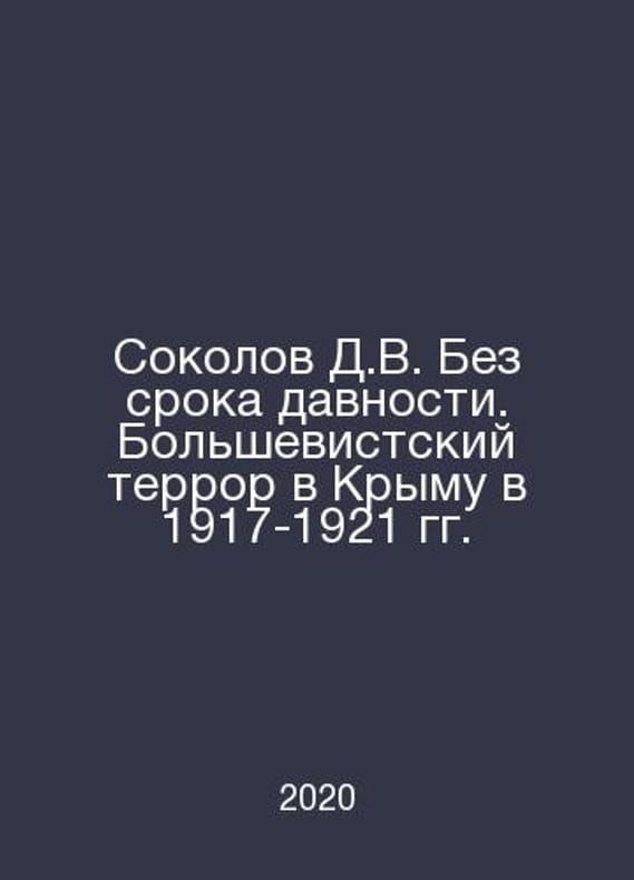 Sokolov D.V. No statute of limitations. Bolshevik terror in Crimea in 1917-1921 In Russian /Sokolov D.V. Bez sroka davnosti. Bolshevistskiy terror v Krymu v 1917-1921 gg. Simferopol. Lower Oryanda 2020..Contact us for details or to request photos of available books. Delivery of this book could take longer than normal due to additional handling time before shipping, and no rush delivery options are available. Please let us know if you have a specific date by which you need to receive your order. SKUalb7cc0cc7f628be39a