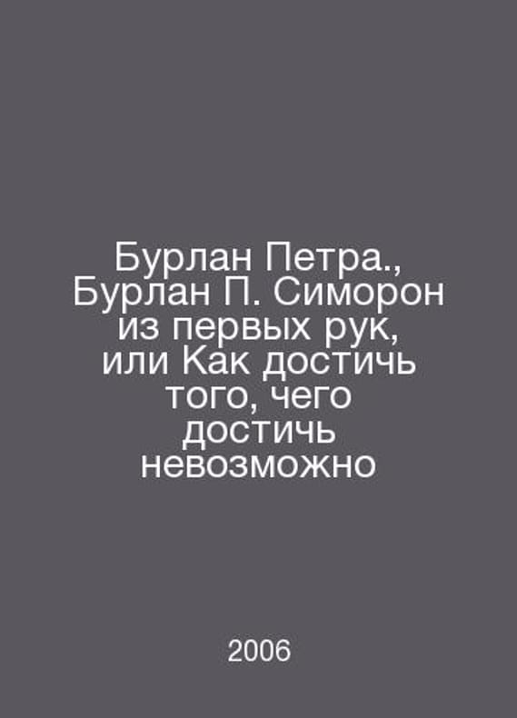 Burlan Petra., Burlan Simoron firsthand, or How to Achieve the Impossible In Russian /Burlan Petra., Burlan Simoron iz pervykh ruk, ili Kak dostich togo, chego dostich nevozmozhno Ill.: Prime-Euromark 2006. Contact us for details or to request photos of available books. Delivery of this book could take longer than normal due to additional handling time before shipping, and no rush delivery options are available. Please let us know if you have a specific date by which you need to receive your order. SKUalb7dc2b6894c59ef12
